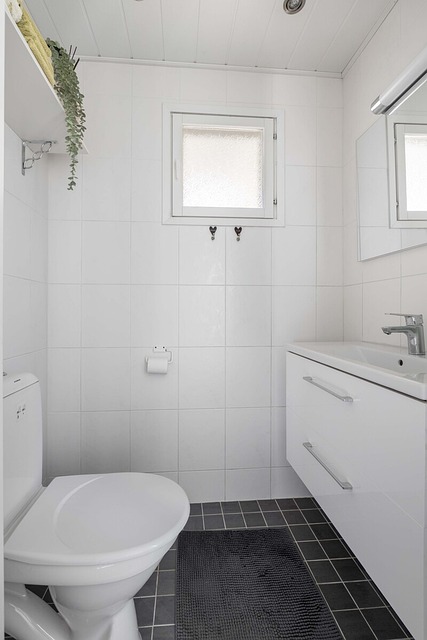 - Suihku, wc-istuin, lattialämmitys, peilikaappi, pesukoneliitäntä, suihkuseinä, allaskaappi, ja kiinteät valaisimet