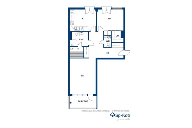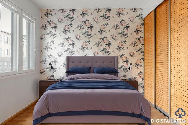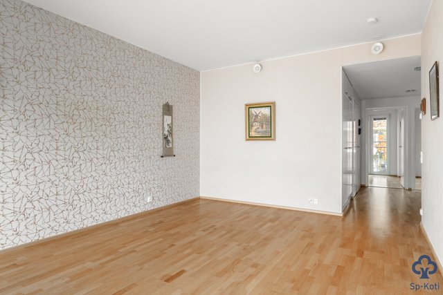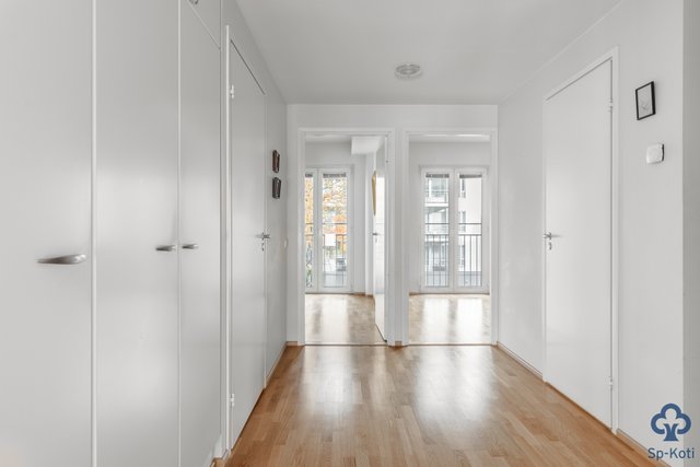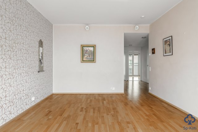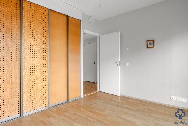 - Parkettialattia, seinät maalattu / tapetoitu. Makuuhuoneen liukuovien takana on sekä vaatehuone että kaapistot, lisäksi on ranskalainen parveke.