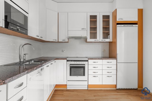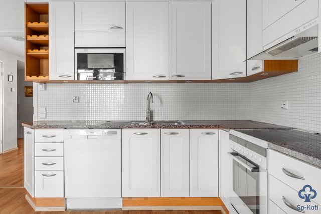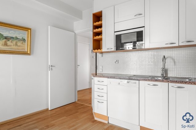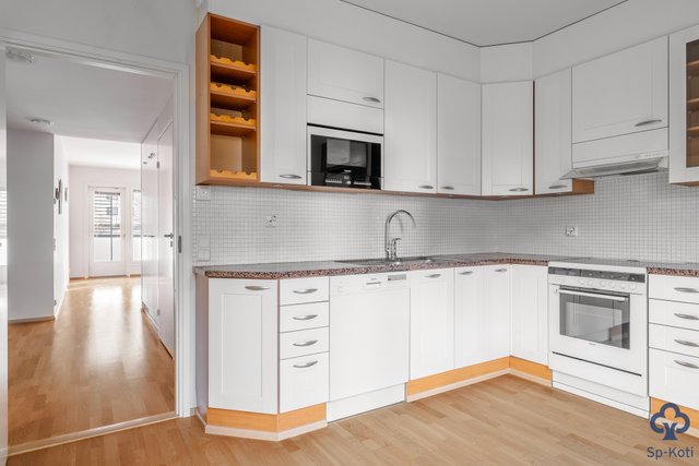 - Keittiössä parkettilattia (lattialämmitys), maalatut seinät, ranskalainen parveke. Työtasot kiveä ja kaapistojen välitila laattaa. Varusteet: jääkaappipakastin, keraaminen liesi, astianpesukone, liesituuletin, integroitu mikrouuni.