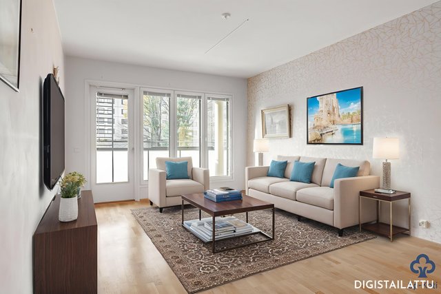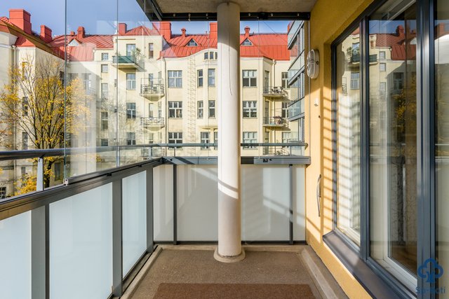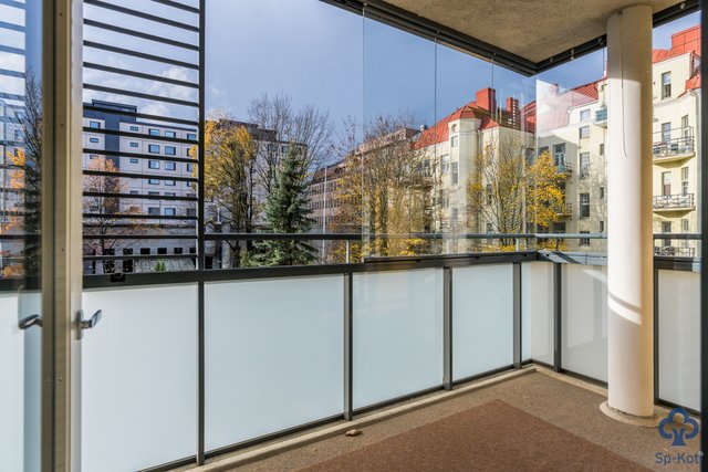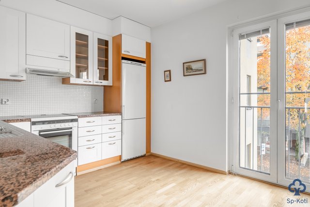 Keittiössä on laadukkaat kivitasot, mukavasti kaappitilaa sekä ranskalainen parveke, joka tuo lisää valoa ja ilmavuutta tilaan. Tilavasta olohuoneesta on käynti lasitetulle parvekkeelle (sisäpihan suuntaan), jonne voi vetäytyä rentoutumaan rauhassa kaupungin sykkeestä huolimatta.