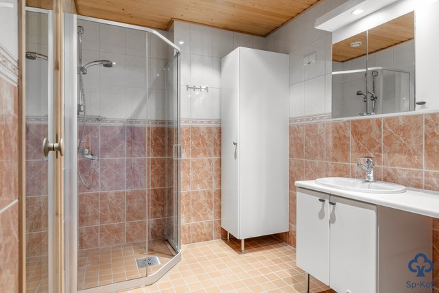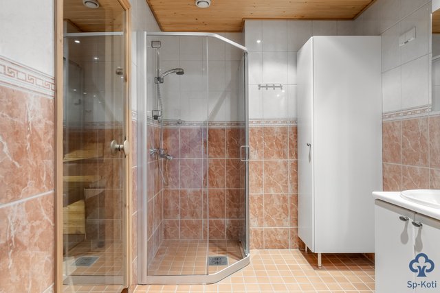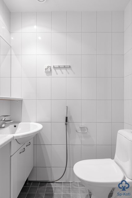 - Seinät ja lattia laatoitettu (lattialämmitys). Suihku, suihkuseinä, kaapisto, pyykinpesukoneliitäntä, peilikaappi, pesuallas, allaskaappi.