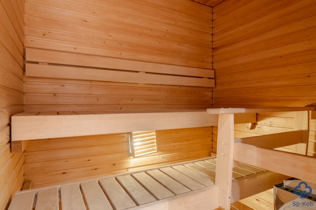 - Sähkökiuas, lattiassa laatta, seinät ja lauteet paneloidut.
