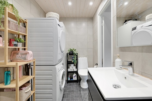 - Suihkuseinä, peili, pesukoneliitäntä, ja suihku