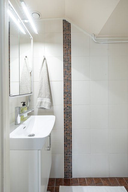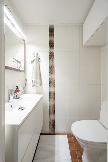 - Tilava kylpyhuone, joka on uusittu edellisen omistajan aikaan, arviolta vuonna 2000. Varusteluna: kaksi suihkua, pesukoneliitäntä, peilikaappi, allaskaapisto. Lattia ja seinälaatat maalattu kosteaan tilaan tarkoitetulla kaakelimaalilla.