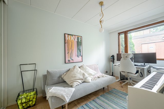 - Kolme virallista makuuhuonetta, jonka lisäksi alakerran varasto remontoitu huonekäyttöön (ei ikkunaa). Yksi makuuhuone sisääntulokerroksessa ja muut huoneet alakerrassa.