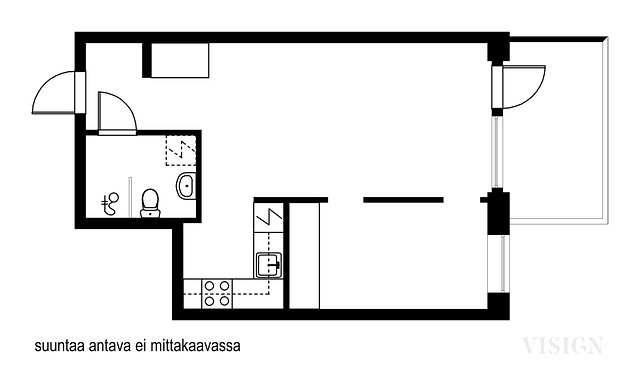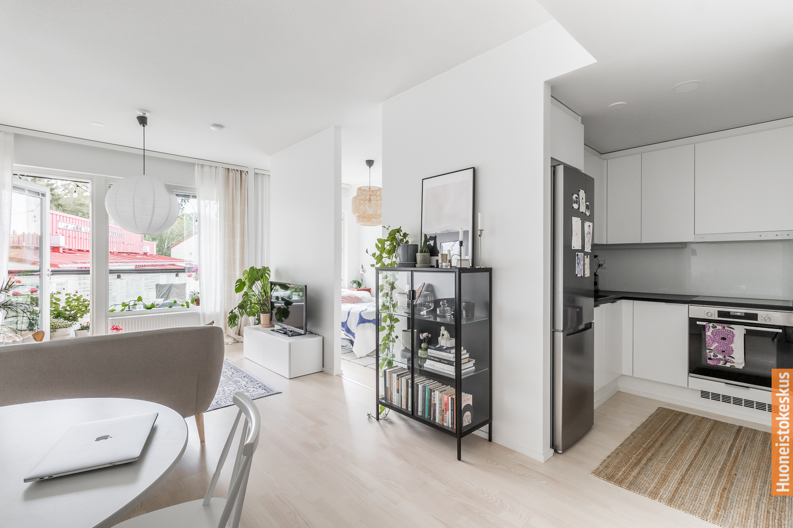 Kun astut sisään asuntoon näet sen heti. Olohuone on juuri sopivan kokoinen, jotta kaikki tarvittava löytyy. Samoin kompakti makuuhuone, jonne myös kaapit mahtuvat.