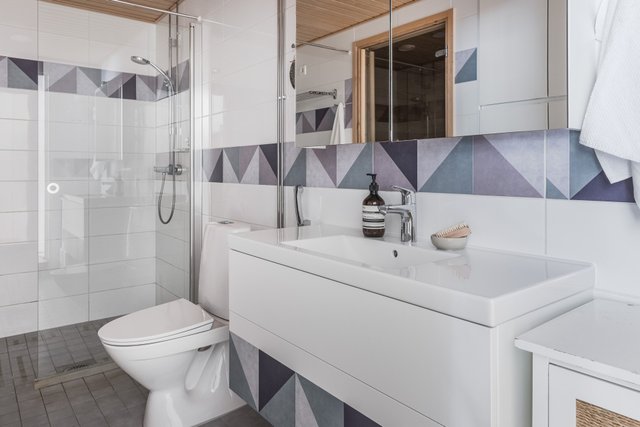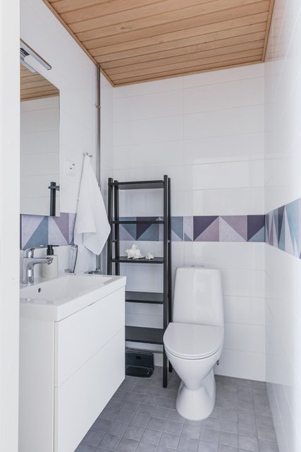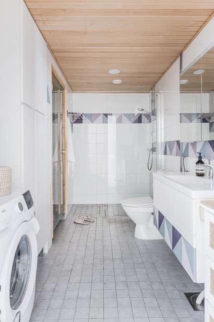 - Laattalattia. Seinät laattaa. Varustus: Peilikaappi, allaskaappi, pyykkikaappi, käsisuihku, wc-istuin, suihku, suihkuseinä, pesukoneliitäntä.