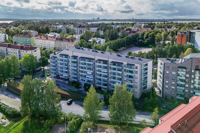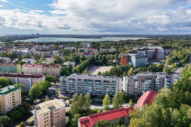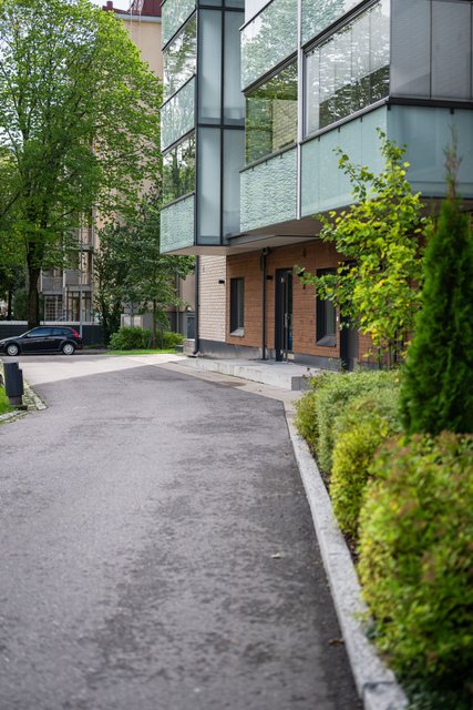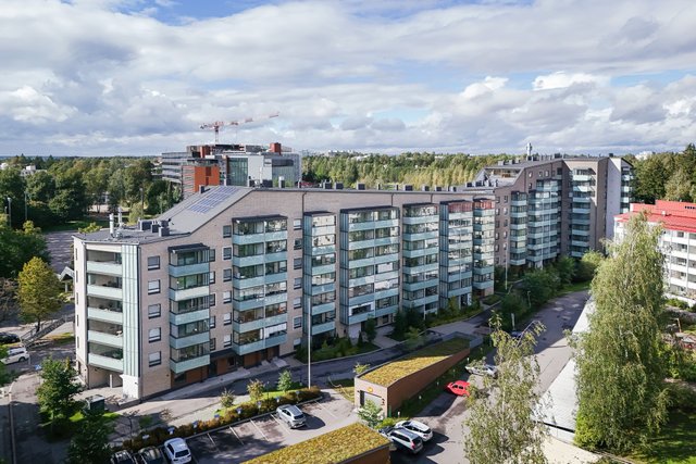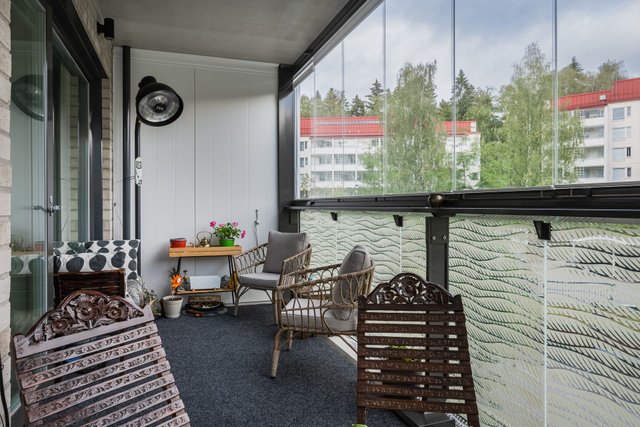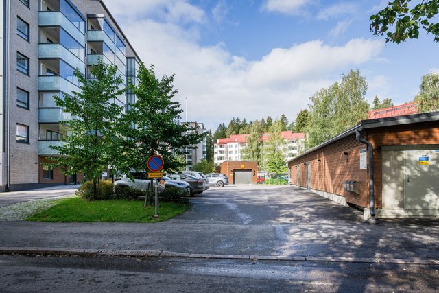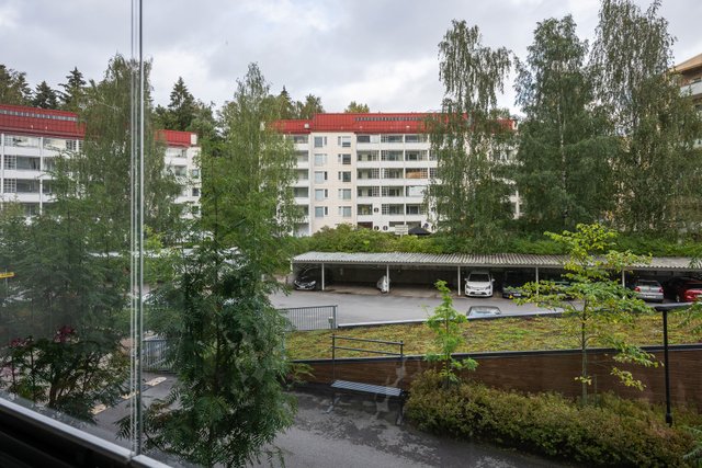 - Parvekkeelta upeat näkymät pihalle. Rakennuksen takana on metsä/viheralue. Rakennuksen edessä erityisesti kesällä ja syksyllä kaunis puustoinen tie.