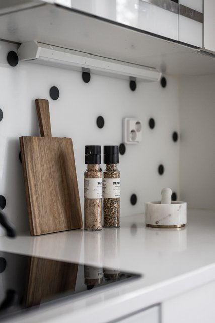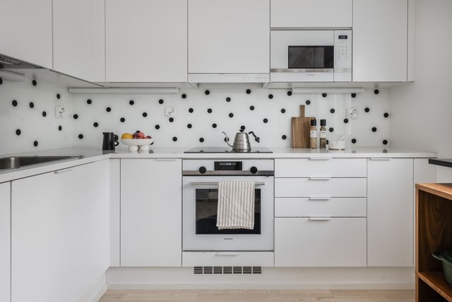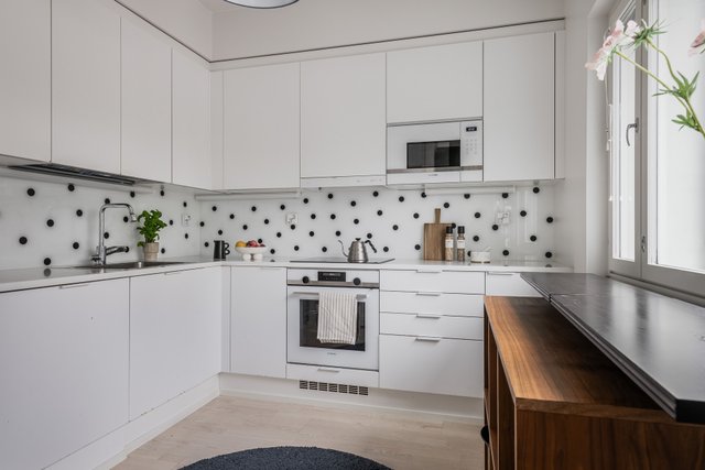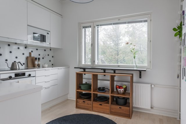 - Parkettilattia. Seinät maalattu. Kalusteväli lasia. Työtaso kvartsikomposiittia. Varustus: (Siemensin kodinkoneet), induktioliesitaso, uuni, liesikupu, astianpesukone, jääkaappi ja kaappipakastin, mikroaaltouuni.