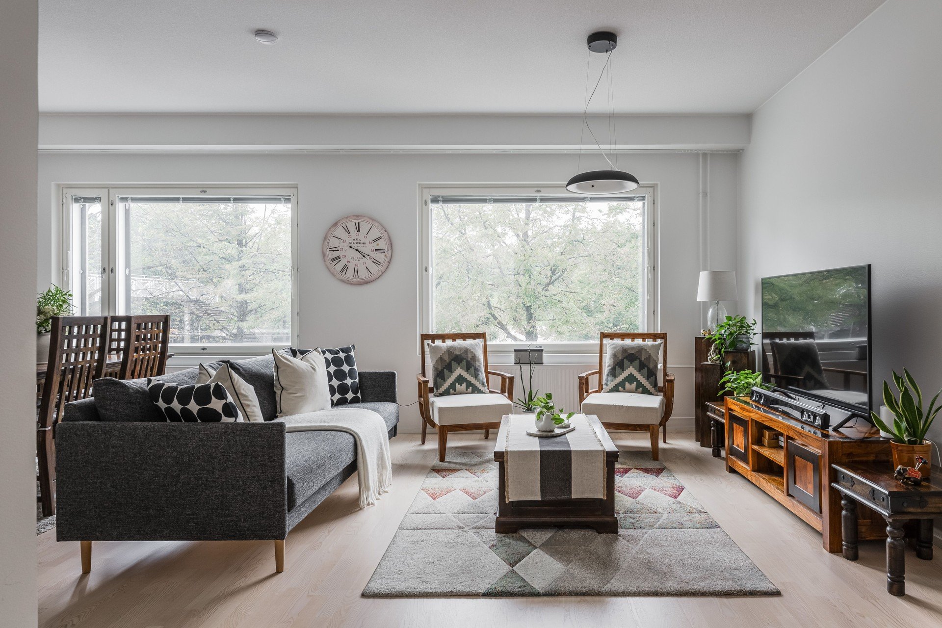 Ikkunoista avautuvat kauniit näkymät: olohuoneesta ja keittiöstä voi katsella kadun puiden latvoja, ja takapihan suunnasta avautuvat vehreät pihanäkymät. Vuodenaikojen vaihtelu ja syksyn ruska tuovat asumiseen luonnon kauneutta suoraan kodin ikkunoista.