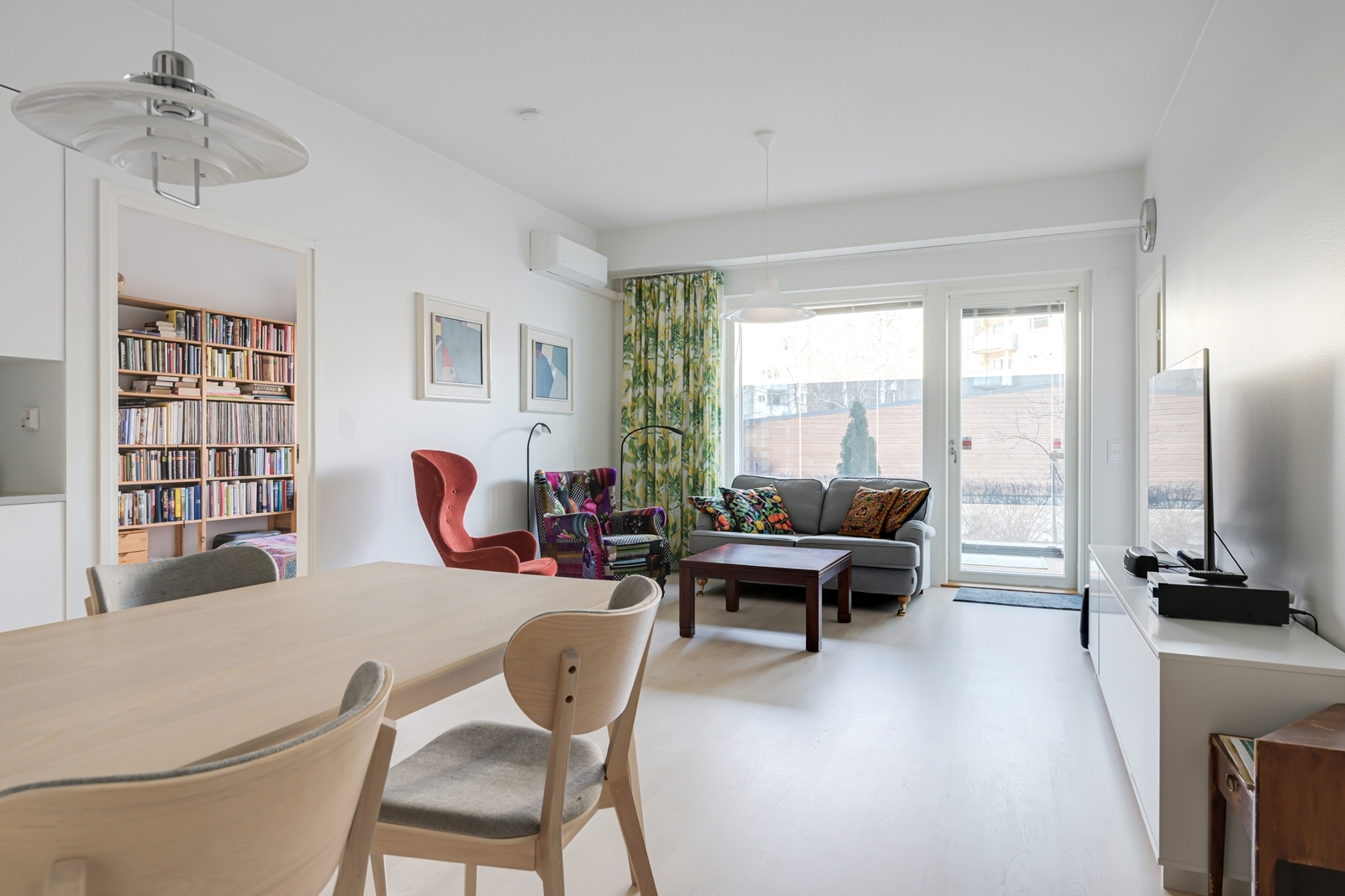 Olohuone on tilava ja sen yhteydessä on tilaan avautuva keittiö, sekä osittain lasitettu terassi. Makuuhuoneet ovat hyvänkokoisia ja molemmissa on säilytyskaappeja valmiina. Kylpyhuoneessa on paikka pesukoneelle ja säilytystilaakin on mukavasti. Eteisen yhteydessä on lisäksi erillinen wc sekä liukuovikaapisto. Kylpyhuoneen yhteydessä on alkujaan ollut sauna, mutta se on muutettu vaatehuoneeksi kiuas ja lauteet poistamalla. Lisäviihtyisyyttä tuovat terassilasien peilikalvot, jotka lisäävät yksityisyyttä asunnon ollessa maan tasalla sekä viilennyskone, jolla asunto pysyy sopivan lämpöisenä kesien kuumetessa.