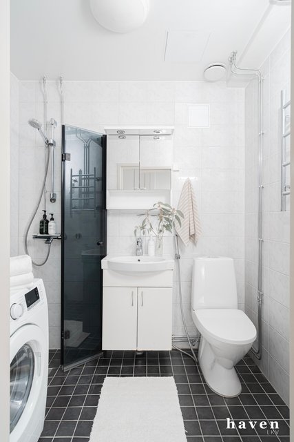 - Tilava, laatoitettu kylpyhuone lattialämmityksellä. Peili- ja allaskaappi, seinäkaappi, suihkuseinät, pesukoneliitäntä ja oma tila pesutornille. Kylpyhuone remontoitu 2008-2009.