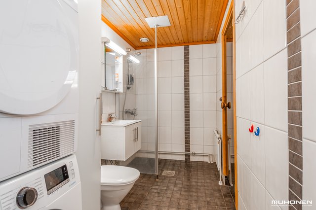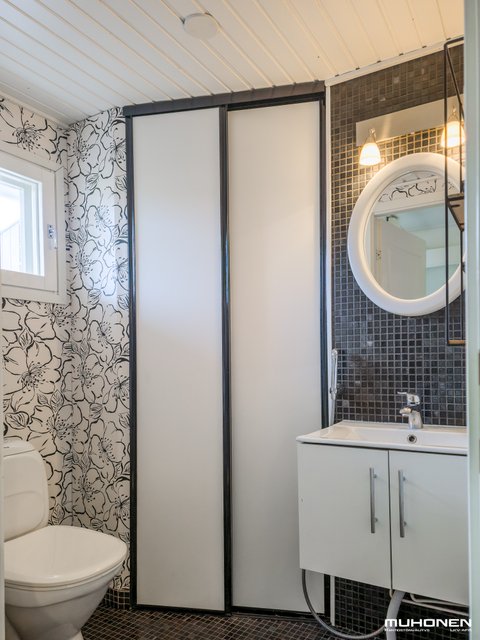 - WC-istuin, suihku, suihkuseinä, pesukoneliitäntä, peilikaappi, ja lattialämmitys