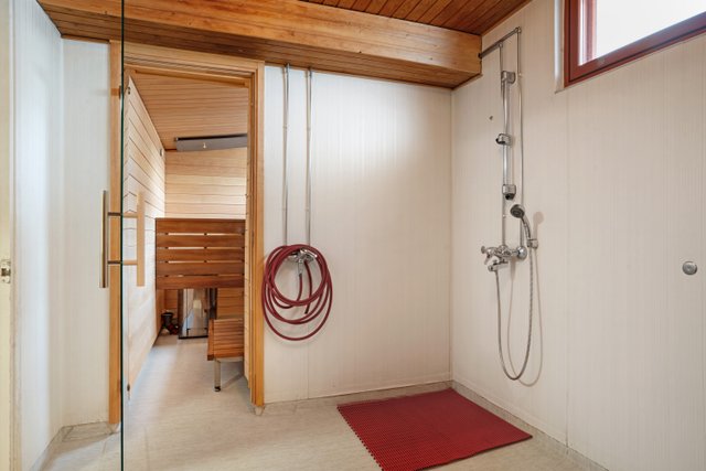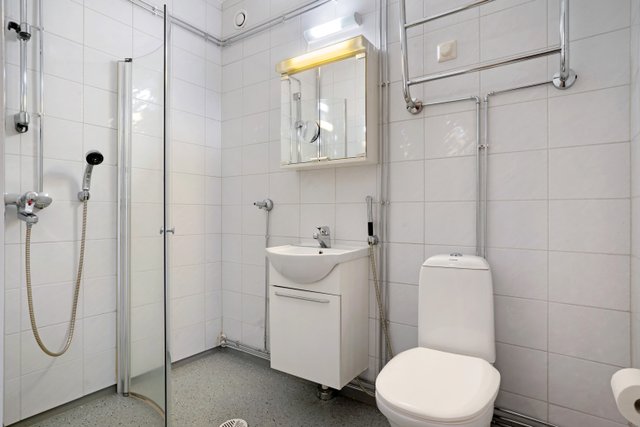 - WC-istuin, suihku, suihkuseinä, pesukoneliitäntä, allaskaappi, pesuallas, peilikaappi, bidee-suihku, ja suihkuseinä