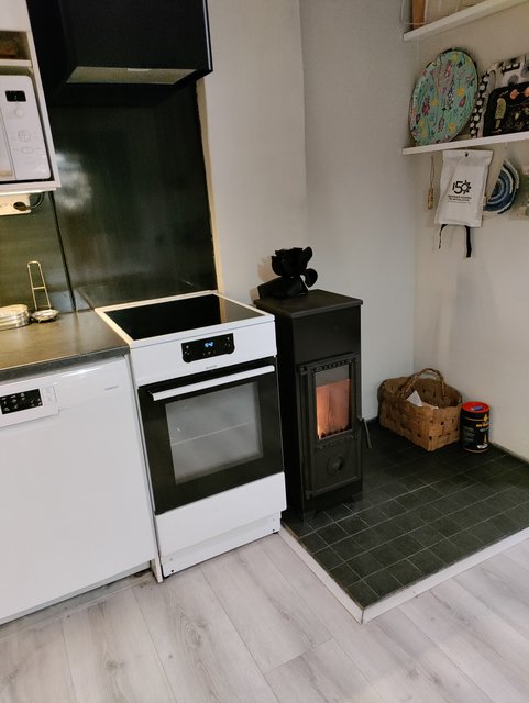 - -Induktioliesi (kiertoilma ei toimi) liesituuletin, jääkaappi, pakastinkaappi, astianpesukone, kamiina -Työpöytä, tiskipöytä, kaapistot -Laminaattilattia