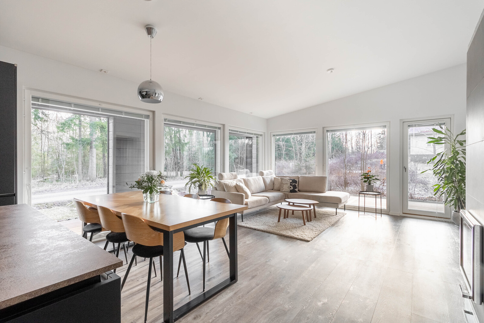 Talossa on vesikiertoinen lattialämmitys ilmavesilämpöpumpulla ja mukavuustekijänä joka huoneen kattava jäähdytys. Avarassa olohuoneessa on Uuniseppien varaava takka. Suuret ikkunat avautuvat kahdella puolella olevalle katetulle terassille, johon on rakennusluvassa valmius haluttaessa myös lasitukselle ja paljulle. Kaksi erillistä wc:tä ja kahdessa makuuhuoneessa vaatehuoneet. Modernissa keittiössä on monipuolinen valaistus sekä automaatti- ja sähkötoimintoja sekä aamiaiskaappi. Saunassa kanadanmäntylauteet, integroidut kaiuttimet musiikin kuunteluun yms.
