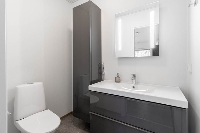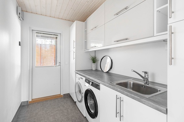 - Pyykkikaapit, lattialämmitys, pöytätaso, pesukoneliitäntä, pesukone, lattiakaivo, ja kuivausrumpu