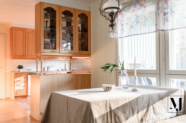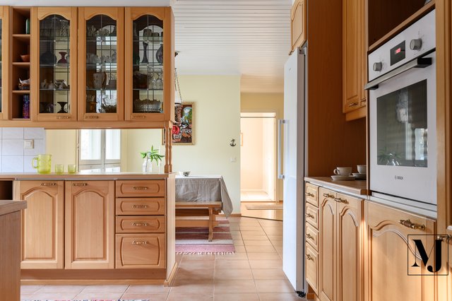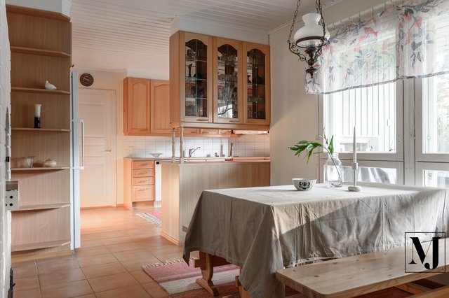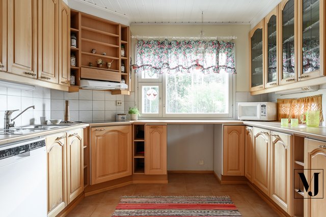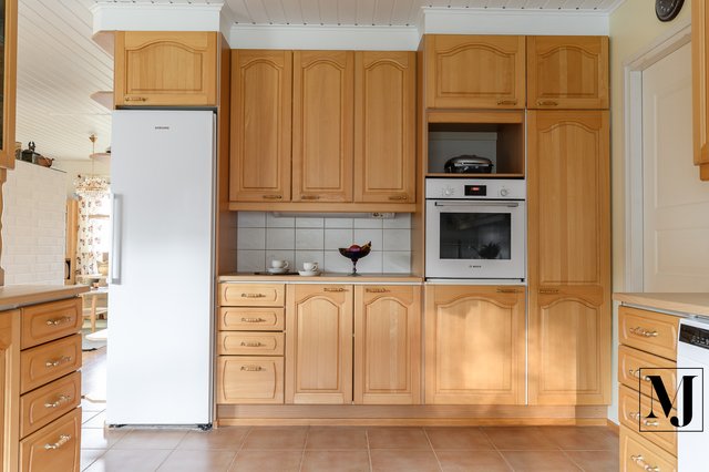 Keittiö on tilava ja toimiva ja se tarjoaa erinomaiset puitteet arjen ruoanlaittoon. Puiset pyökki kaapinovet tuovat lämpöä sekä runsaat kaappi- sekä laskutilat. Jääkaappi, astianpesukone, erillisuuni ja induktioliesi on uusittu vuonna 2022. Helppohoitoinen laattalattia lisää käytännöllisyyttä ja keittiön yhteyteen mahtuu hyvin ruokailuryhmä omaan ruokailutilaansa.