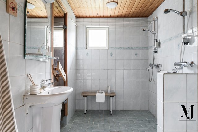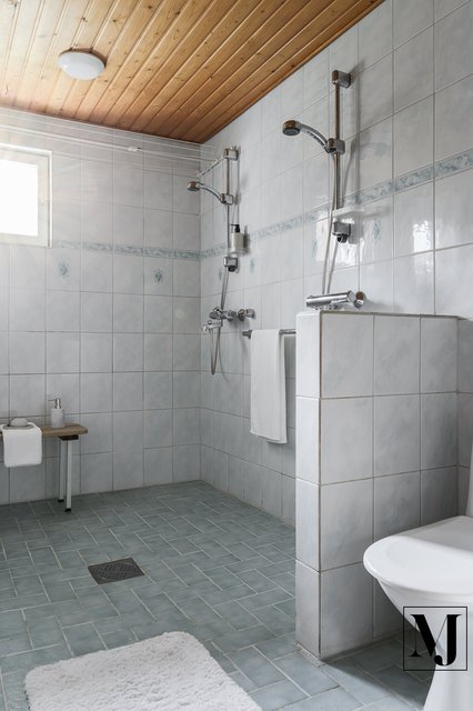 - Kylpyhuoneessa on kaksi suihkua, wc-istuin, käsienpesuallas sekä peili jotka tekevät kokonaisuudesta käytännöllisen ja toimivan.