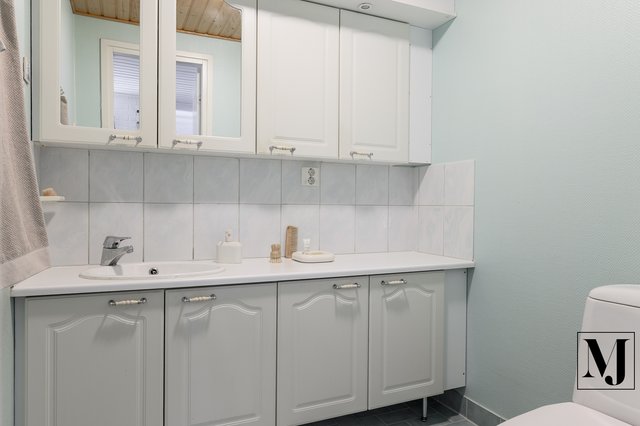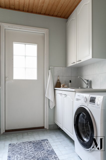 - Kodinhoitohuoneessa on vesipiste pesualtaalla, kaapistot ja pyykinpesukoneliitäntä.