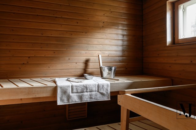 - Tilava sauna jossa seinäpaneelit on käsitelty. Sähkökiuas ja tuuletukseen löytyy myös ikkuna.