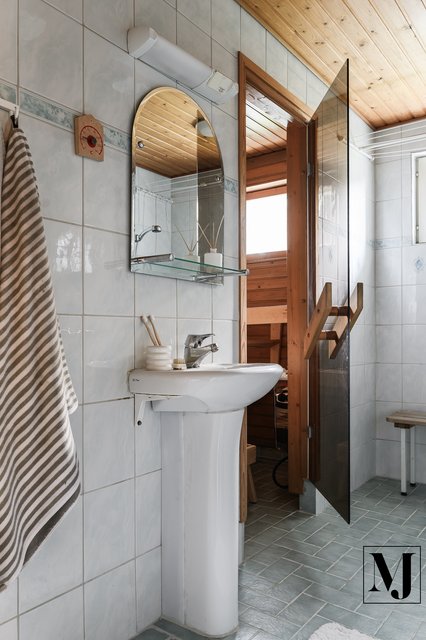 Saunaosasto on tilava ja kylpyhuoneessa on kaksi suihkua ja wc-tila. Kodinhoitohuoneesta on oma uloskäynti pihalle.