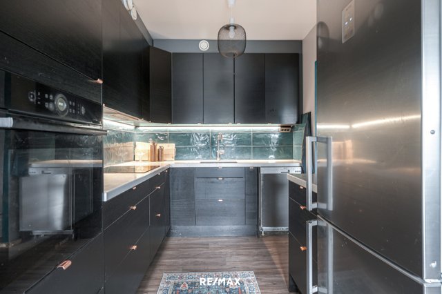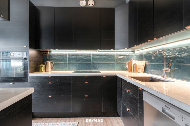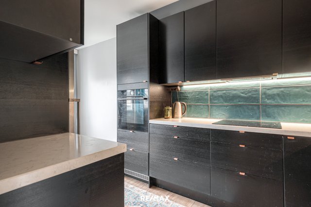 - Musta upea Epoq:n keittiö on puoliksi avointa tilaa ja sen edustalle mahtuu ruokailuryhmä. Se on remontoitu v. 2019, kuten muutkin asunnon pinnat. Kaappien välitilassa Ihana merenvihreä iso laatta, tasot kvartsia. Mikroaaltouunin paikka on kaapin sisällä poissa silmistä.