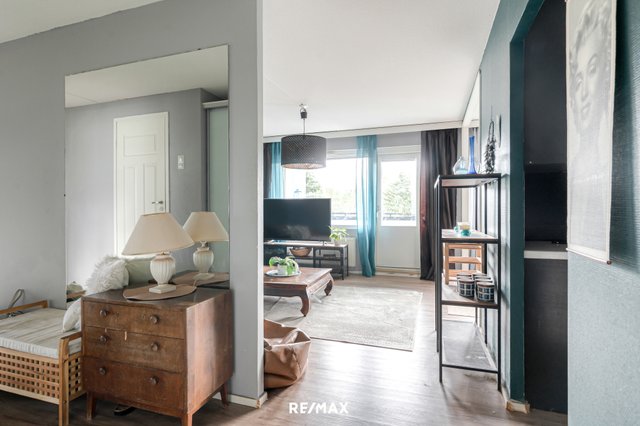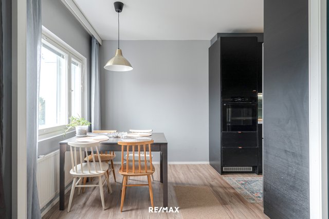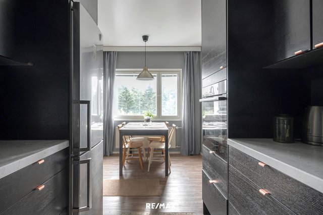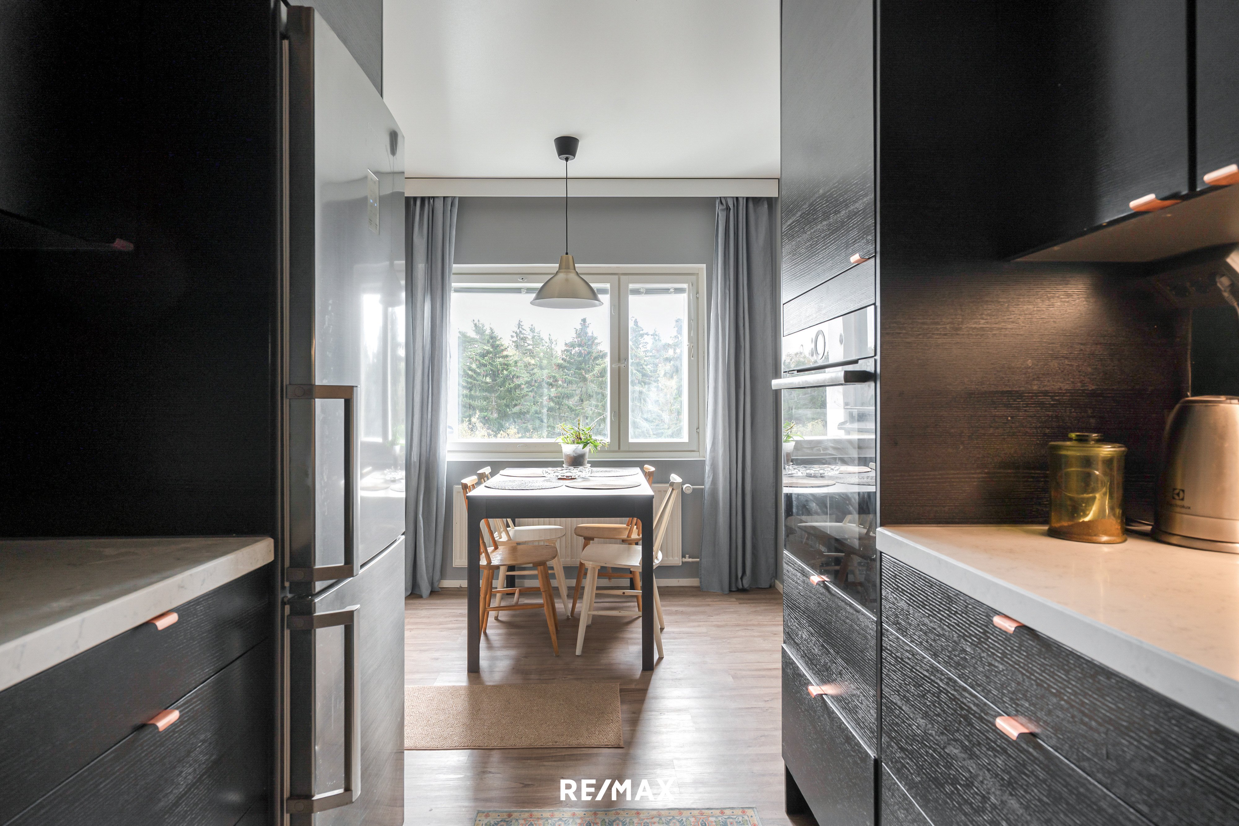 Koti on käynyt ammattilaisten toimesta mittavan remontin läpi v. 2019 ja hurmaa nyt upeine mustine keittiöineen ja kvartsitasoineen ja moderneine kylpyhuoneineen. Toki elämisen jäljet jo hieman näkyvät kodissa näin muutaman vuoden jälkeen. Koti on maalisävyiltään tunnelmallinen, mutta kuitenkin valoisa aamu- ja keskipäiväaurinkoineen.