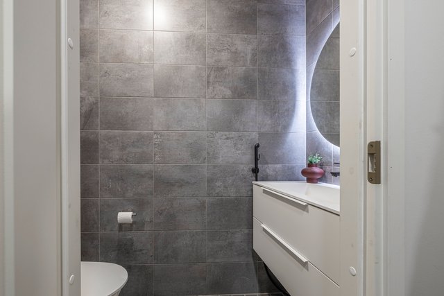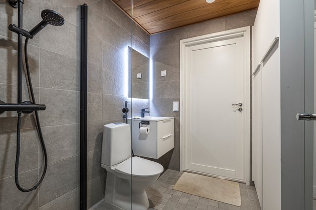 - WC-istuin, suihku, lattialämmitys, pesukoneliitäntä, pesuallas, allaskaappi, ja bidee-suihku