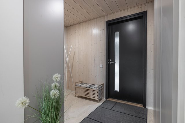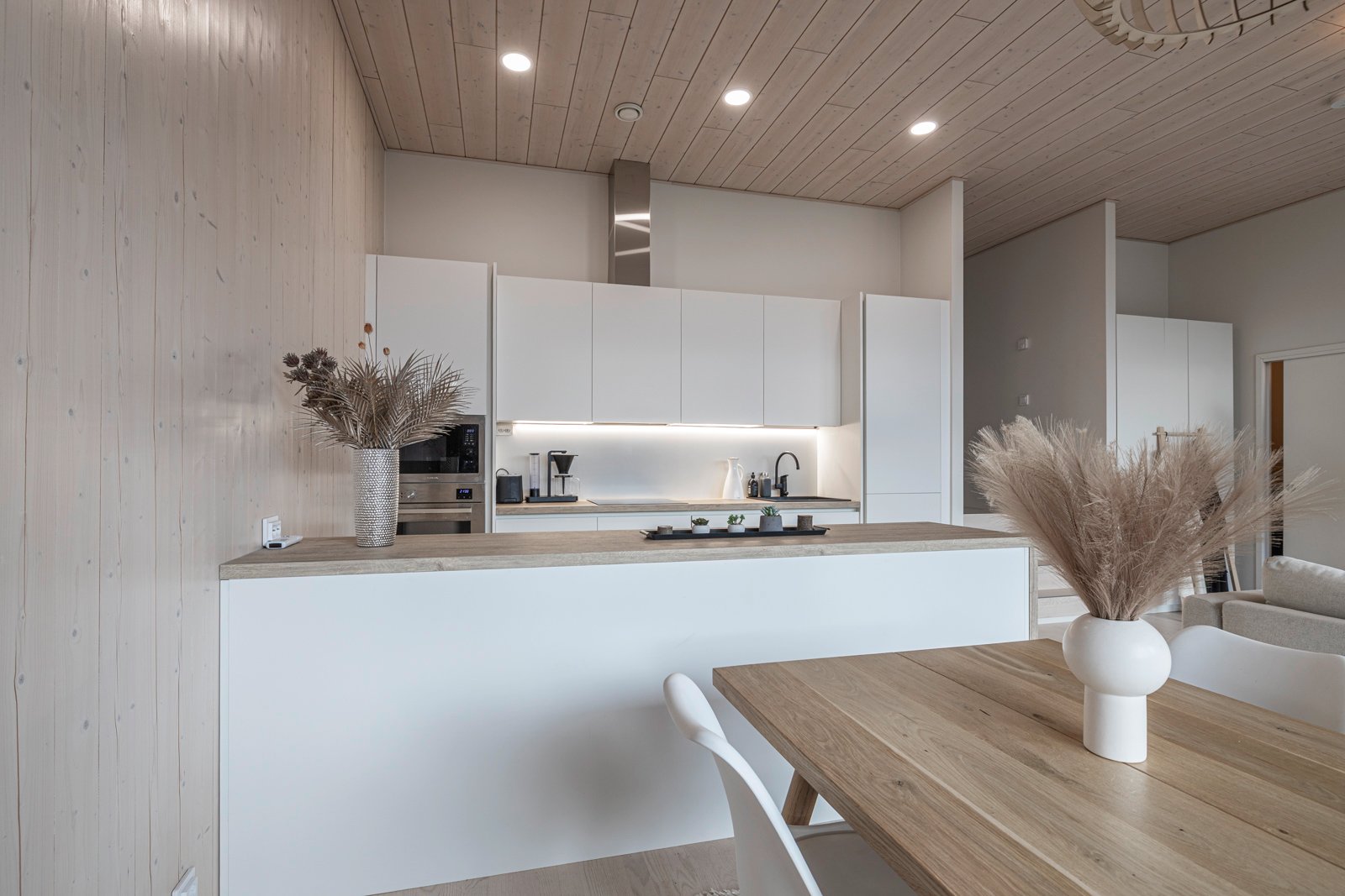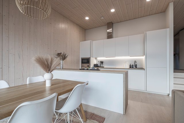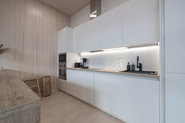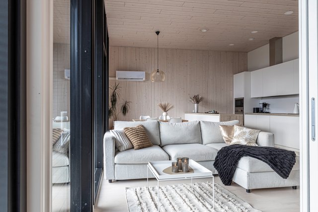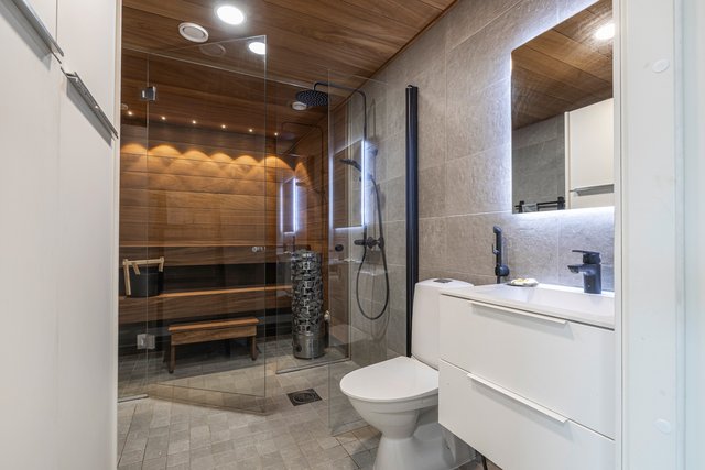 Keittiö on varustettu laadukkailla kodinkoneilla, kuten induktioliedellä ja erillisellä uunilla, ja keittiösaareke tarjoaa lisää työskentelytilaa. Kylpyhuone on tilava, pyykkikone on siististä liukuoven takana. Oma upea sauna kutsuu rentoutumaan päivän päätteeksi.