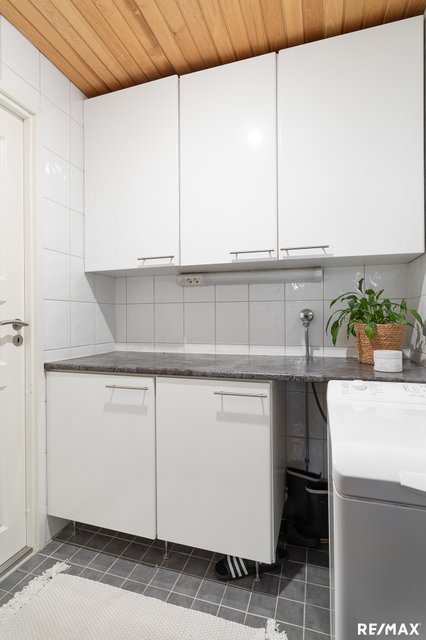 - Kodinhoitotilassa on työskentelytaso, jonka alla kaapit ja tila pesukoneelle. Seinään kiinnitetty yläkaapit.