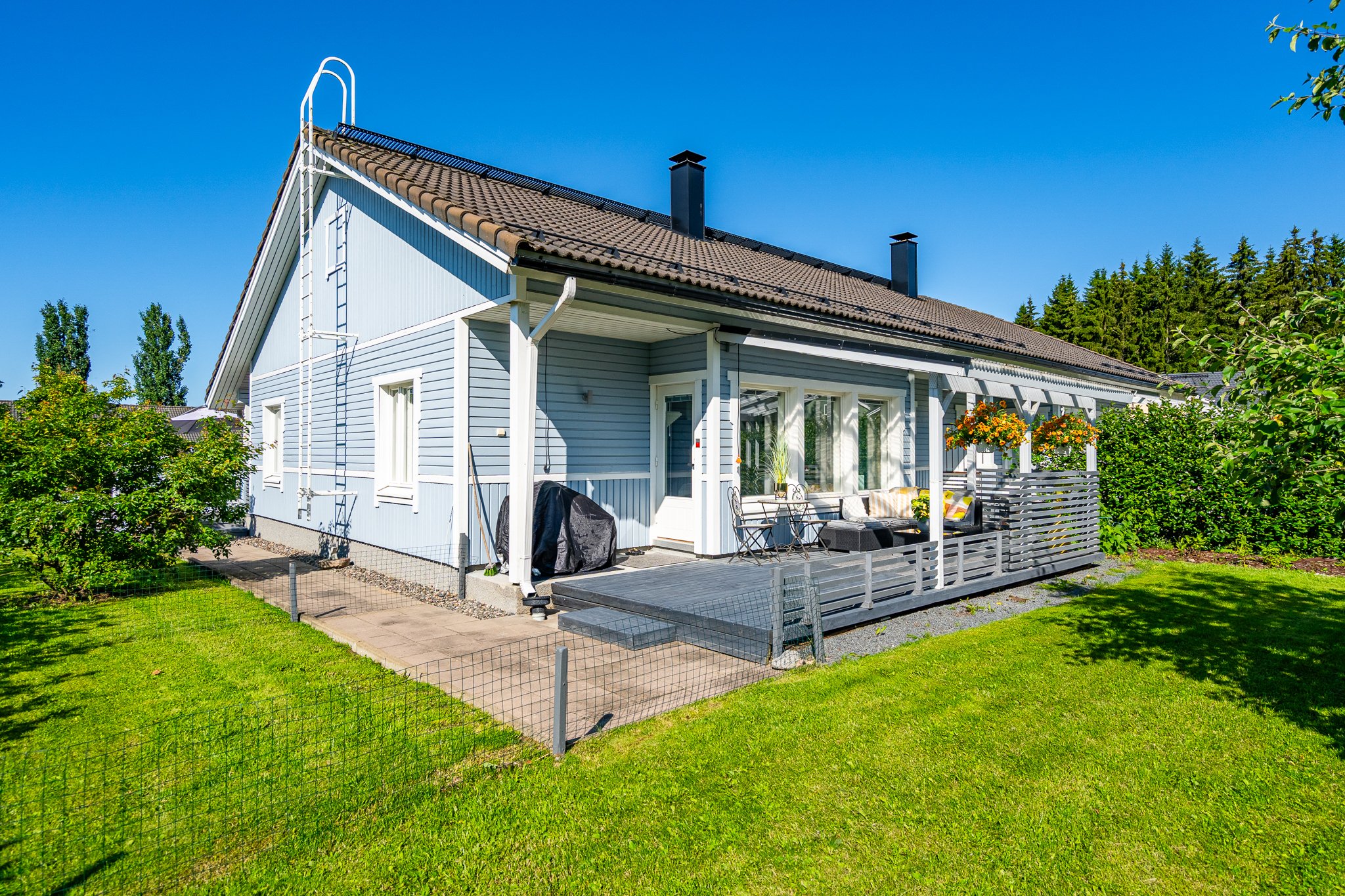 Näkymiltään takapihalle päin olevassa avarassa olohuoneessa on leivinuunillinen varaava takka ja todella paljon ikkunapinta-alaa. Olohuoneesta on kulku osin valokatetulle ja rima-aidatulle takaterassille sekä sen jatkona olevalle laatoitetulle alueelle jonka kautta pääsee kulkemaan etupihan puolelle. Asunnolla on myös nurmipihaa takana ja talon sivulla.