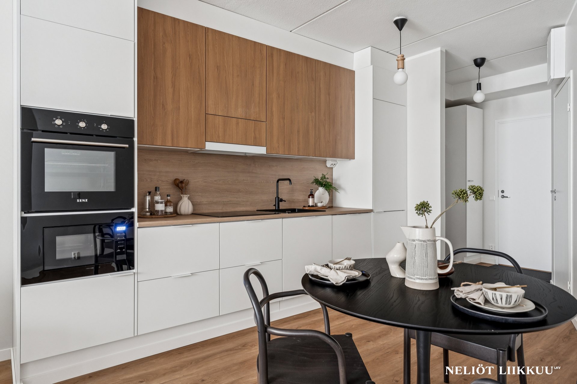- Keittiön varusteet: Integroitu jääkaappipakastin (Grundig), integroitu astianpesukone (Senz), erillisuuni (Senz), induktiotaso, integroitu mikroaaltouuni (Point 3), liesikupu (Vallox Delico KTD), kiinteät valaisimet, laminaattitasot (Tammi natur). Komposiittiallas, Damixa-hana (silhouet mattamusta), vetiminä Lungo valkoinen, Oviko keittiö. Keittiön pintamateriaalit: välitilalaminaatti (Tammi natur), vinyylilattiat (Kermos Creme Oak) ja seinät maalatut.