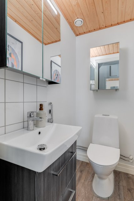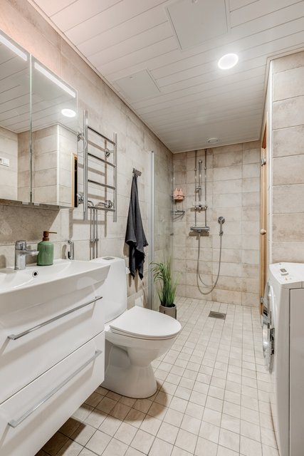 - WC-istuin, suihkuseinä, lattialämmitys, peilikaappi, allaskaappi, pesuallas, pesukoneliitäntä, ja bidee-suihku