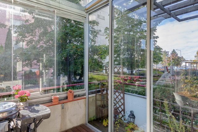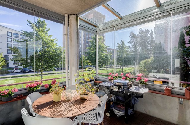 Avara kolmio isolla lasitetulla terassiparvekkeella