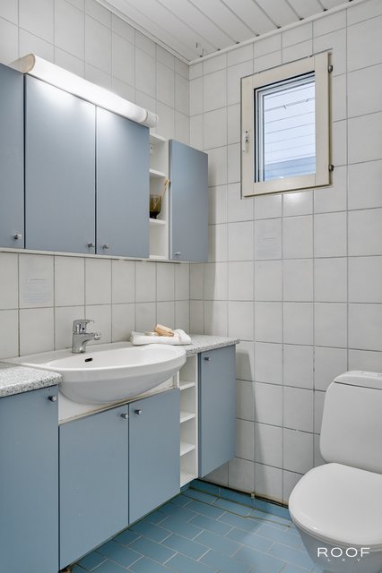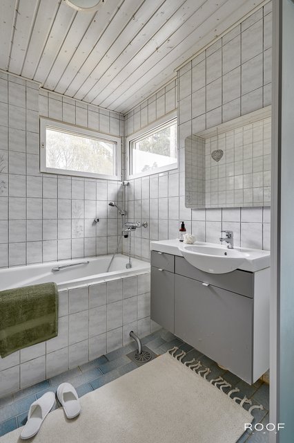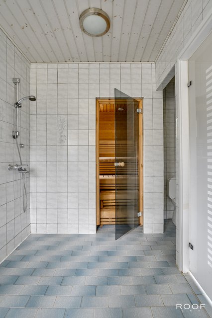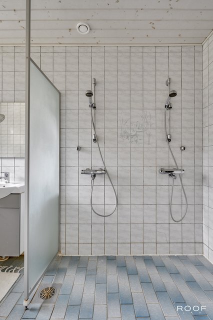 - WC-istuin, suihku (2 kpl), kylpyamme, suihkuseinä, lattialämmitys (sähkö), peili, allaskaappi, ja pesuallas