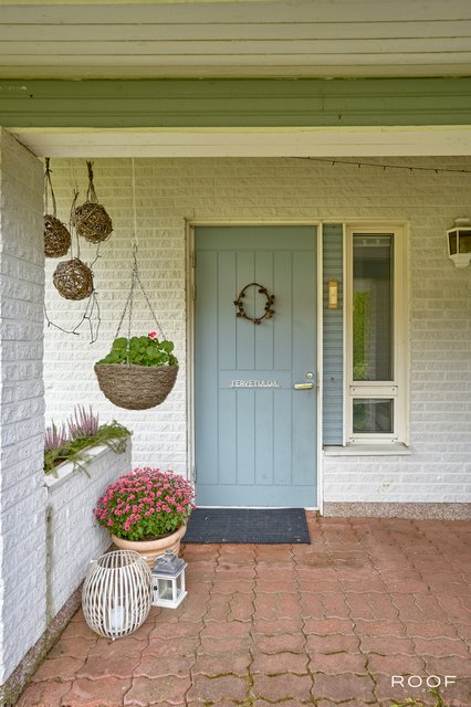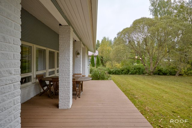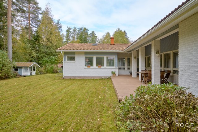Takapiha rajoittuu metsään, tarjoten suojaisan ja viihtyisän ympäristön. Suurella terassilla järjestät helposti kesän perhejuhlat, ja erillinen lasitettu terassi pidentää ulkoilukautta pitkälle syksyyn. Kahden auton talli tarjoaa runsaasti säilytystilaa myös harrastusvälineille.