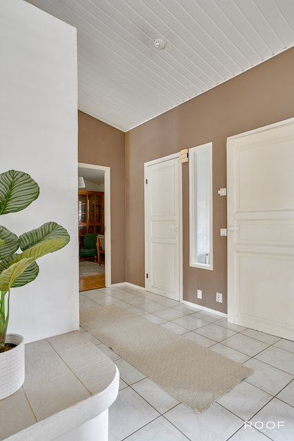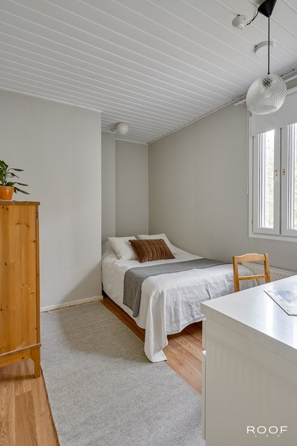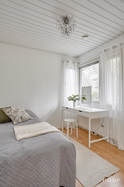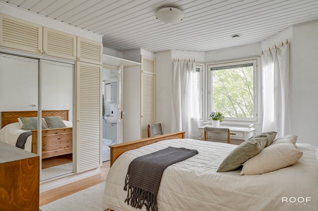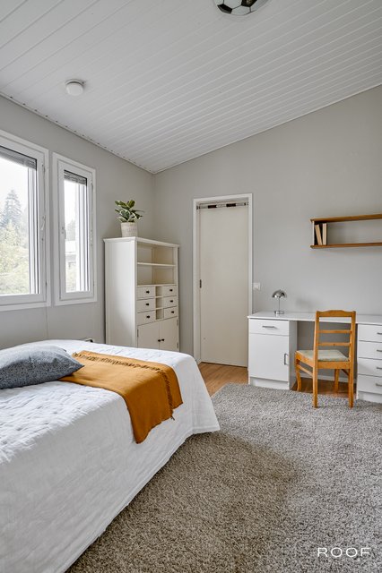 Päämakuuhuoneen oma kylpyhuone tuo arkeen ripauksen ylellisyyttä. Viisi makuuhuonetta mahdollistavat joustavat huonejärjestelyt perheen tarpeiden mukaan. Tilava ja käytännöllinen kodinhoitohuone helpottaa arjen askareita. Saunaosasto, takkahuone, yksi makuuhuoneista sekä erillinen ruokailutila muodostavat oman rauhallisen siipensä talossa.