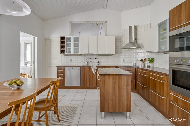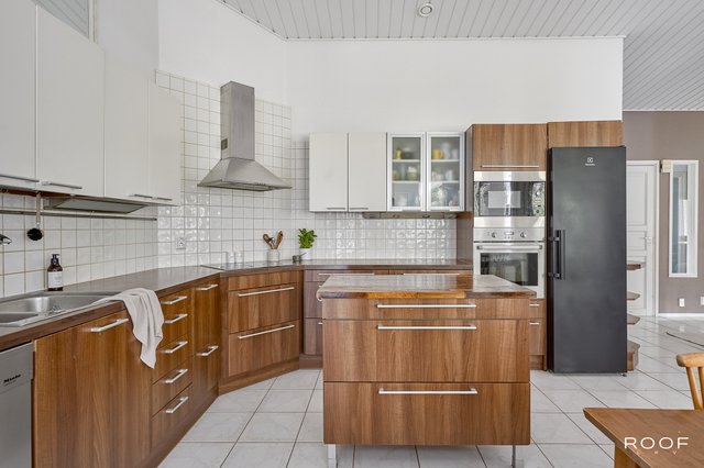 - Jääkaappi (2024), liesi (yksi levyistä ei toimi), erillisuuni, leivinuuni, liesituuletin, mikroaaltouuni, astianpesukone (2023), ja keittiösaareke (irrallinen)