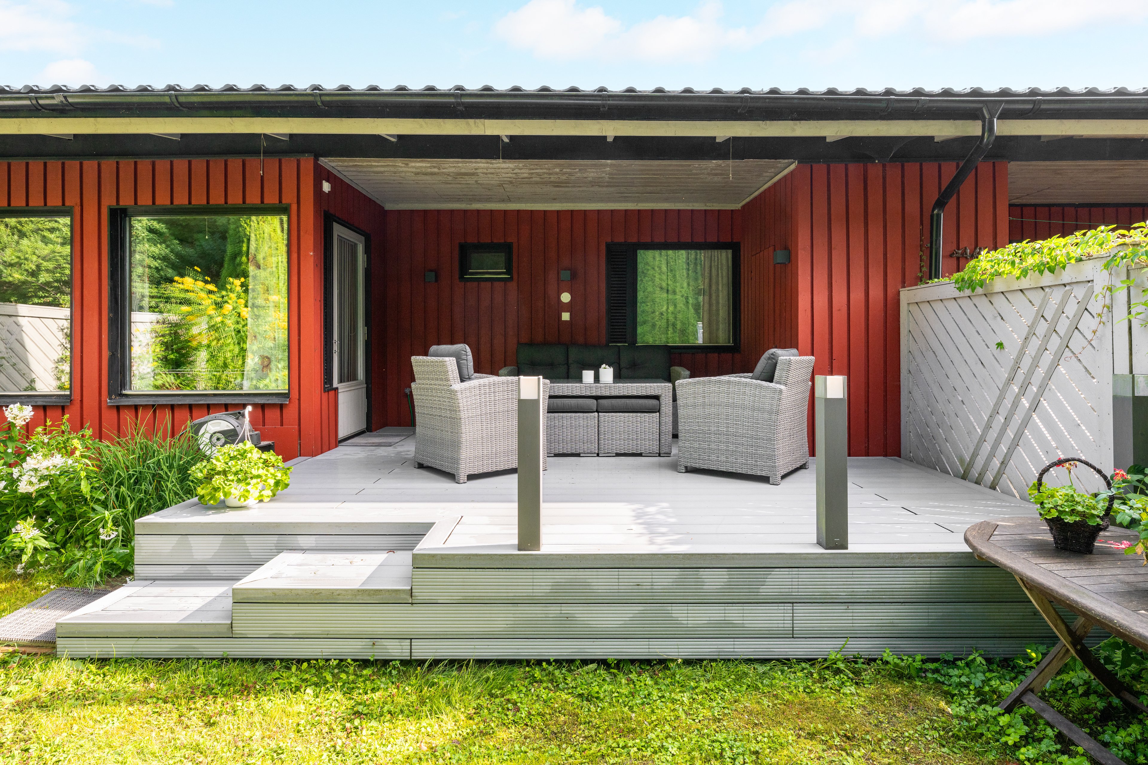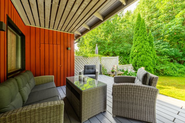 Avarasta olohuoneesta avautuu näkymät vehreälle, metsään rajautuvalle takapihalle. Suuret ikkunat tuovat runsaasti luonnonvaloa sisätiloihin, ja olohuoneesta on käynti osittain katetulle terassille ja suojaisalle pihalle.
