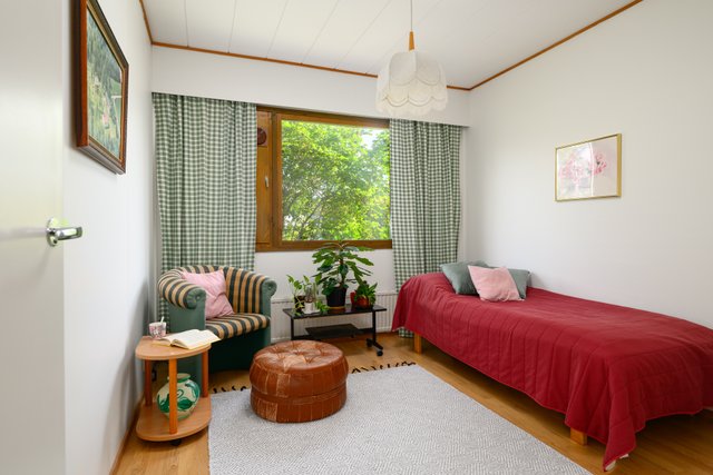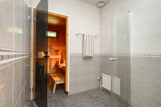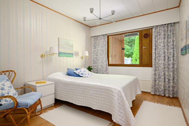 Kodin makuuhuoneet sijoittuvat omaan rauhaansa asunnon toiseen päätyyn, ja niiden välissä oleva vaatehuone tuo arkeen kaivattua säilytystilaa. Erillinen wc toimii samalla pyykkihuollon tilana. Kylpyhuone ja sauna muodostavat oman viihtyisän kokonaisuutensa.