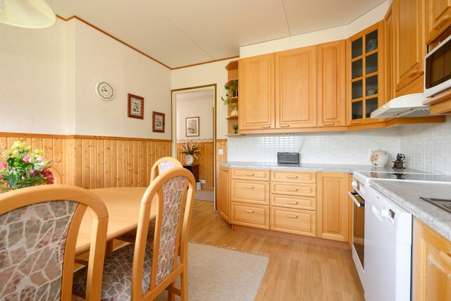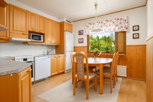 Tämä koti tarjoaa toimivan ja arkea sujuvoittavan pohjaratkaisun rauhallisella ja arvostetulla alueella. Selkeä sisääntulo ja tilava eteinen helpottavat arkea. Erillinen keittiö tarjoaa runsaasti kaappi- ja laskutilaa sekä paikan isommallekin ruokapöydälle.
