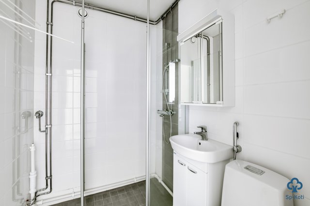 - WC-istuin, suihku, bidee-suihku, peilikaappi, allaskaappi, suihkuseinä, ja pesukoneliitäntä