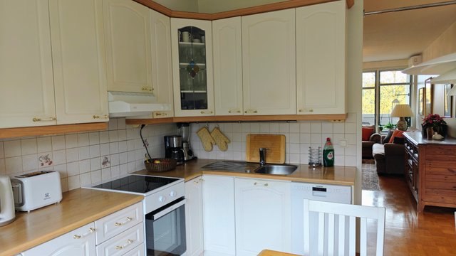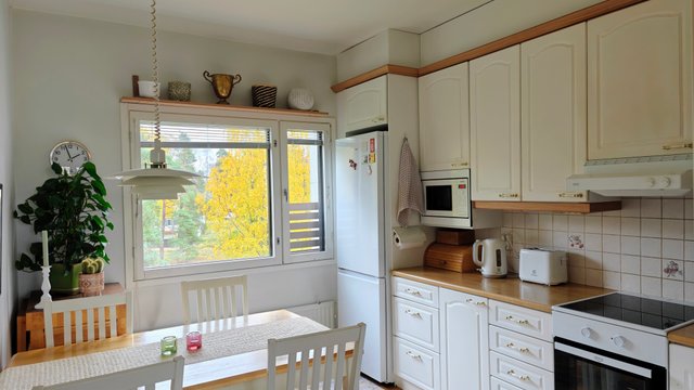 - Jää-/pakastinkaappi, sähköuuni, keraaminen liesitaso, mikroaaltouuni, astianpesukone ja liesituuletin. Tammimosaiikiparketti lattia, tilaa ruokapöydälle. Ikkunasta avoimet näkymät, ilmansuunta itään.