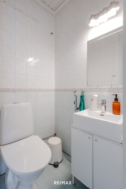 - Suihku, peilikaappi, allaskaappi, pesuallas, bidee-suihku, ja wc-istuin