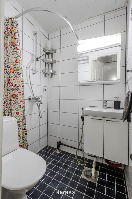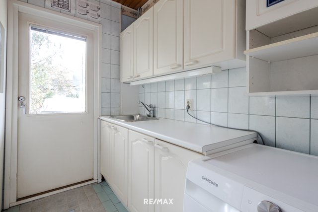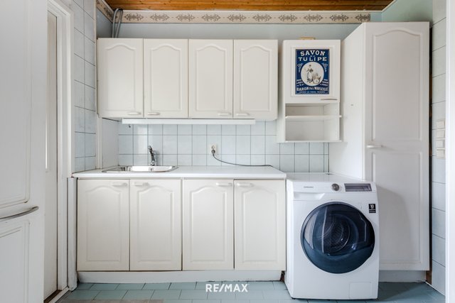 - Pesukoneliitäntä, pesuallas, pöytätaso, reilusti kaappitilaa., ja lattiakaivo