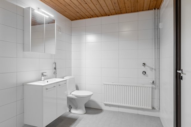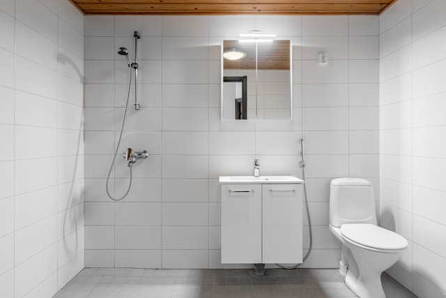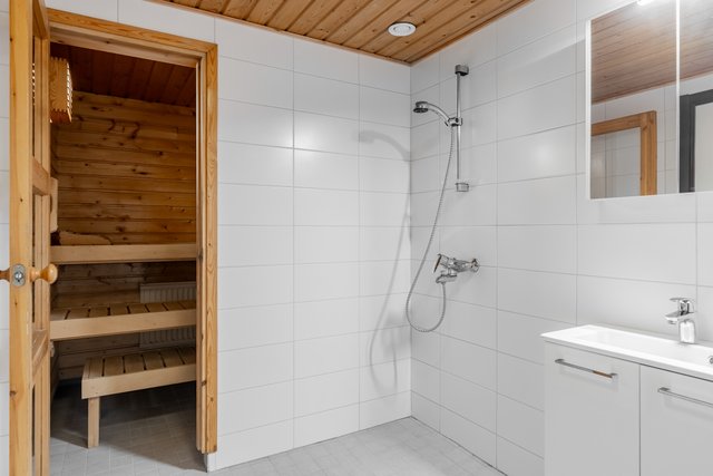 - Kylpyhuone kokonaan uusittu 2025. Varustus: suihku, peilikaappi, pesuallas, hana, allaskaappi, wc-istuin, bidee, pesukoneliitäntä.