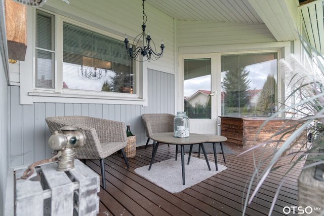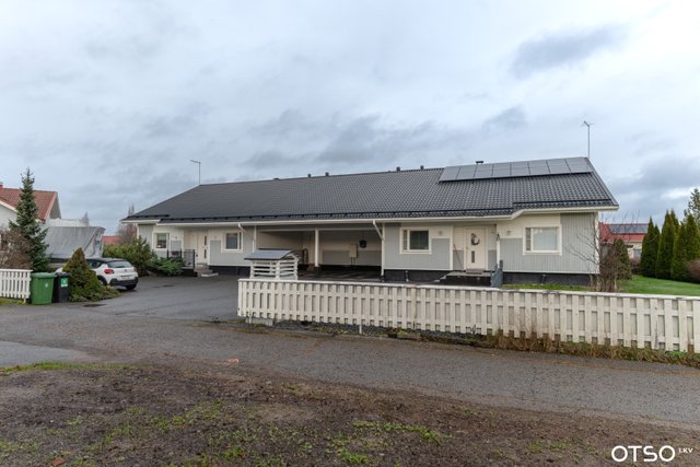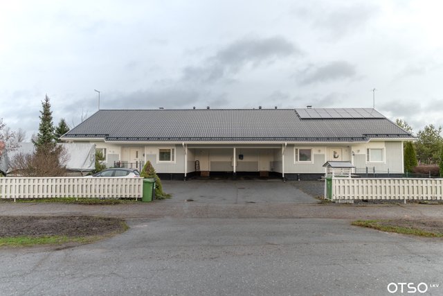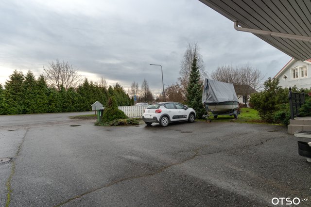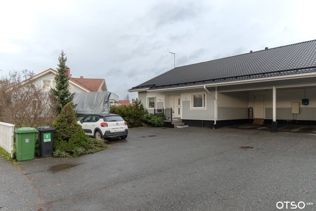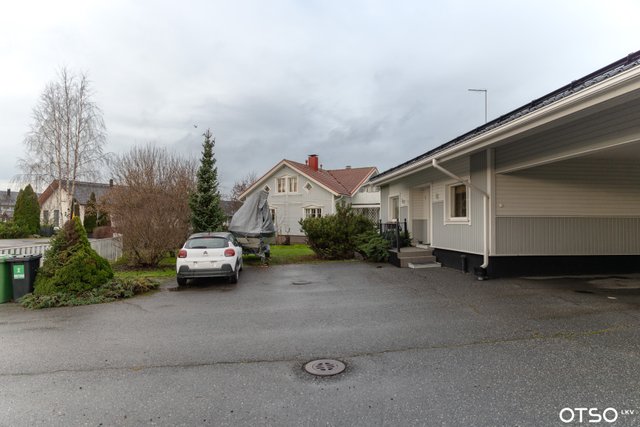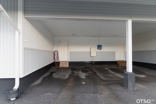 Asunnon arkea täydentävät autokatos sekä sen yhteydessä sijaitseva lämmin varasto, joka tarjoaa runsaasti säilytystilaa.