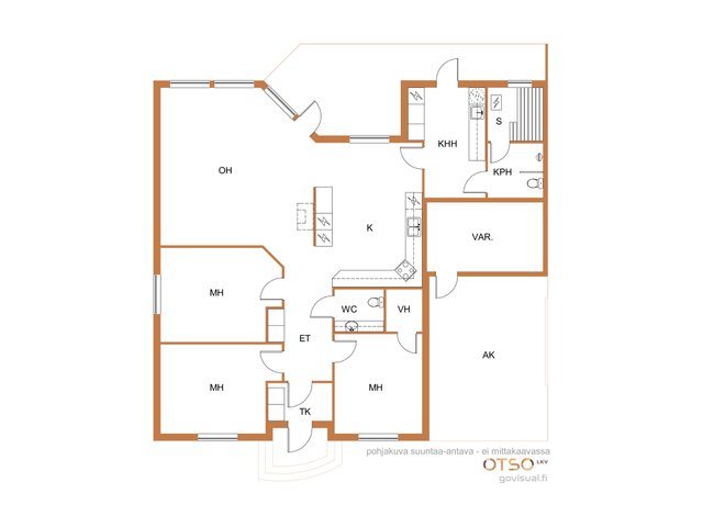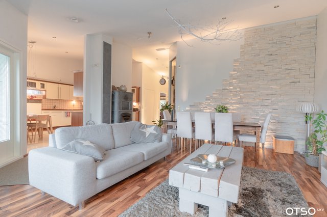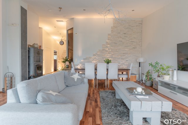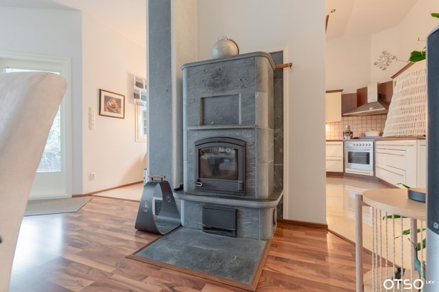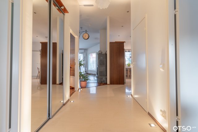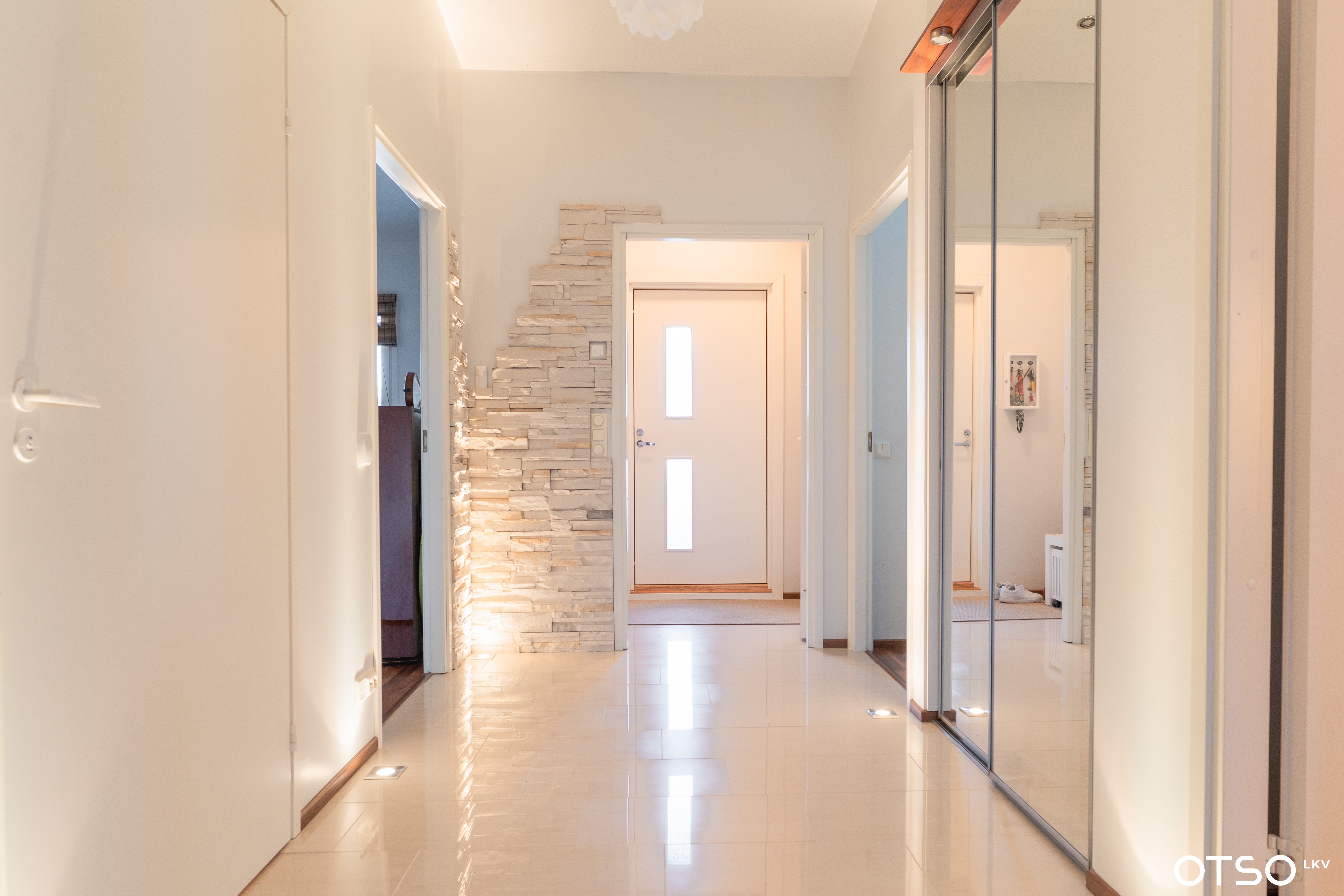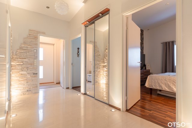 Tämän kodin sisätiloissa yhdistyvät tyylikäs vaalea laattalattia ja lämmin tumma laminaatti, joita täydentävät vaaleat seinäpinnat sekä harkitut tehosteseinät. Harjaan nouseva katto luo avaran ja modernin ilmeen ja kodin sydämessä lämmittää takka, joka tuo tunnelmaa sekä arkeen että juhlaan.