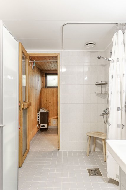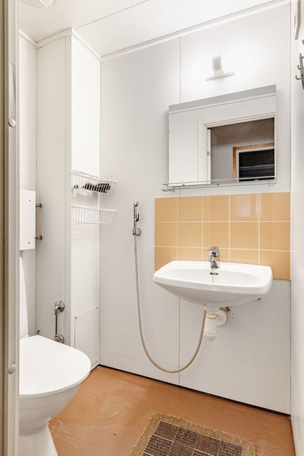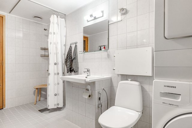 - WC-istuin, suihku, pesukoneliitäntä, peili, pesuallas, allaskaappi, ja bidee-suihku